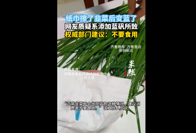 近日,有河北网友发布视频称,怀疑我方购买到了加了蓝矾的韭菜。视频画面浮现,豪侈者用白色的纸巾擦抹洗过两遍的韭菜后,纸巾与韭菜战斗的位置情态酿成了蓝色。