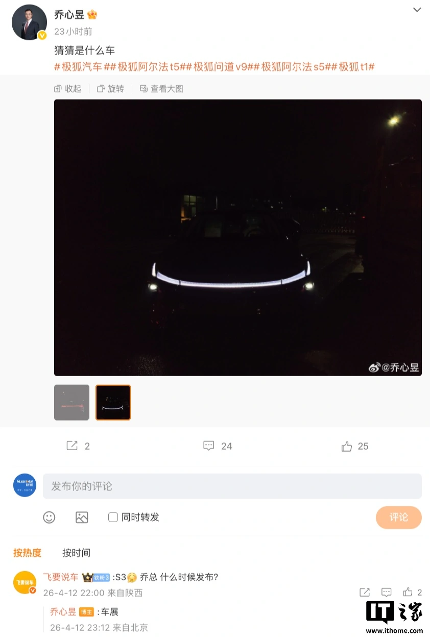 IT之家 4 月 13 日讯息,北汽新能源、极狐品牌用户运营中心副总司理乔心昱在微博发布了极狐 S3 车型预报图,并在驳倒区示意该车将于 4 月 24 日的北京车展崇拜发布。