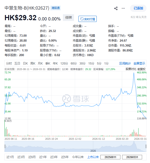 中慧生物(02627.HK),于2025年8月11日在港交所上市,那时以每股刊行价12.90港元、募资约4.3141亿港元。抑止停牌之日,其每股收报29.32港元,较IPO刊行价大涨127.29%,当今其市值约115.36亿港元。