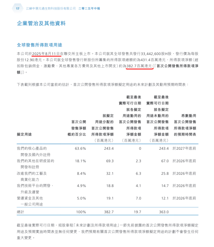 翻查中慧生物的2025年中报发现,中慧生物香港IPO募资总和约4.314亿港元、IPO募资净额约3.827亿港元。