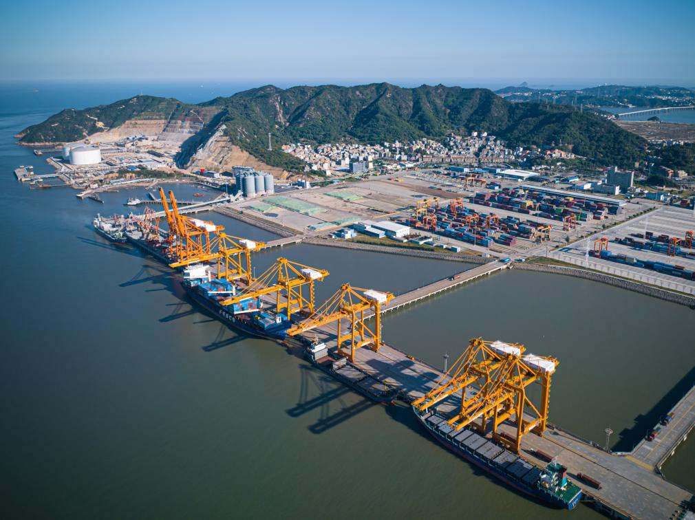 货轮泊岸在温州港状元岙集装箱船埠卸载集装箱(无东谈主机相片)。新华社记者江汉 摄
