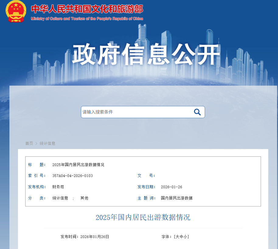 2025年,国内住户出游破耗6.30万亿元,比上年同时增多0.55万亿元,同比增长9.5%。其中,城镇住户出游破耗5.30万亿元,同比增长7.5%;农村住户出游破耗1.00万亿元,同比增长21.4%。