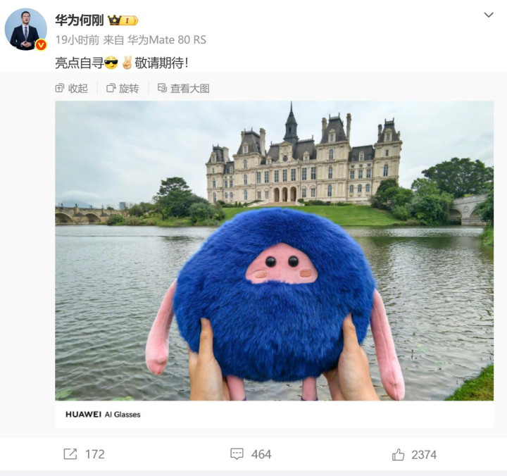 4月8日,华为末端BG首席引申官何刚在酬酢平台发布一张带“HUAWEI AI Glasses”水印的实拍样张,负责宣告华为首款具备影像才调的AI眼镜居品行将登场。