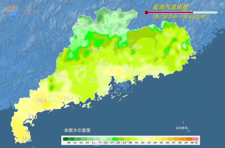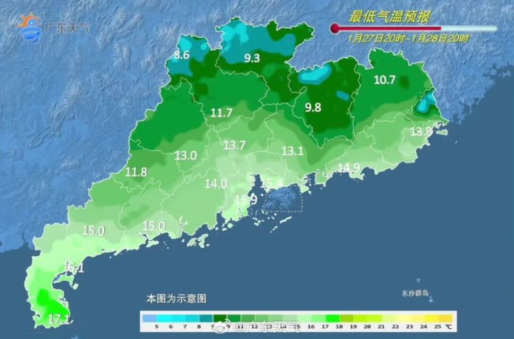 27日,我省大部市县阴天,有小雨局部中雨,雨雾天气能见度低。最低气温:韶关及清远的北部市县7~10℃,珠江三角洲大部、粤东和阳江市县14~17℃,雷州半岛17~20℃,其余市县10~13℃。