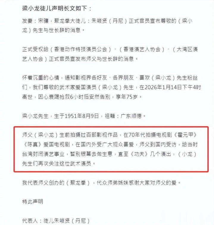 吴京的哀辞钩玄摘要梁小龙的地位:“侠者远去,江湖失色。”香港电影东说念主田启文回忆,梁小龙留给行业最稀少的遗产是“真功夫”:“他让后辈知说念,有货真价实才调被招供。”