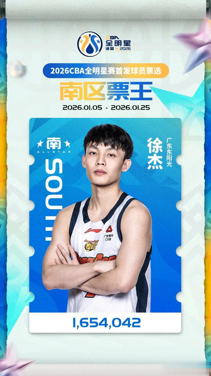 CBA全明星威望投票效果出炉,徐杰以1654042票当选本届全明星票王,也成为了国内球员最高票数的球员。赵睿当选北区票王。