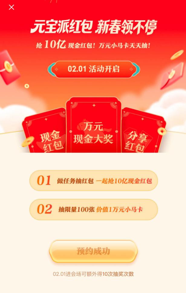 日前,腾讯元宝晓喻将在 2 月 1 日厚爱开启分 10 亿元现款作为,更新到元宝APP 2.55.0 版块就能预约,预约收效还能多拿 10 次抽奖契机。小雷顺遂更新试了下,进口还挺严防标。