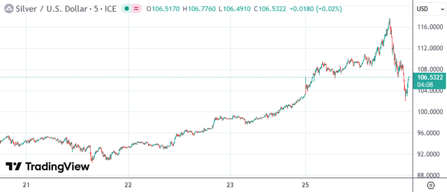 黄金与白银在刷新历史高点后大幅回调。现货白银一度飞腾14%,达117好意思元/盎司,随后跳水并抹去一谈日内涨幅,收报约103.7好意思元/盎司。