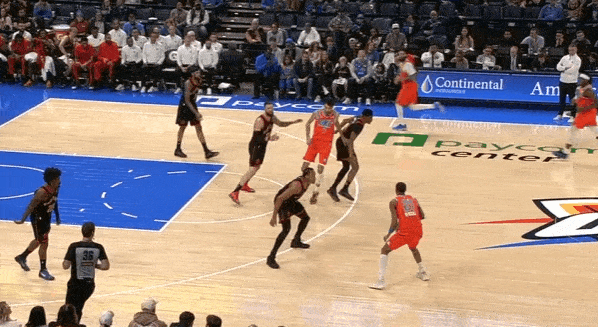 巴恩斯算作小球中锋先是低位顶防小杨,见强侧Slot空切的吕佩尔接球攻框,立即回收站住护框位置,随后高举双手起跳完成遮天大帽。