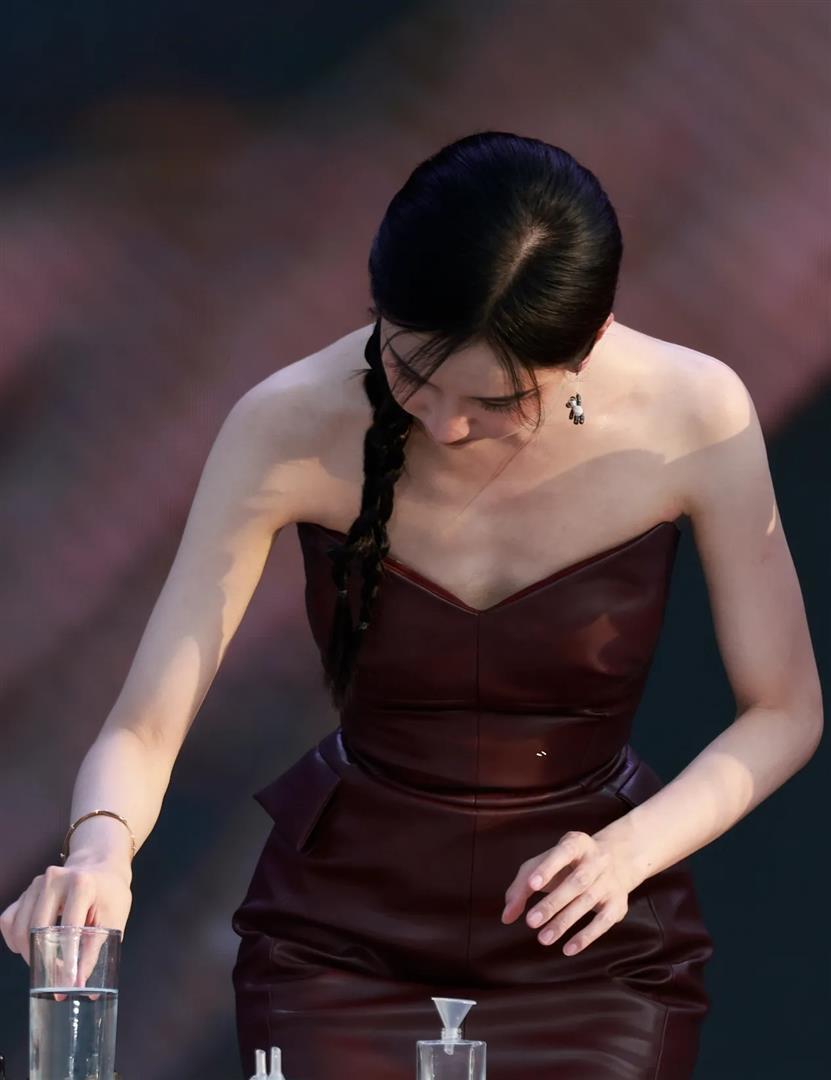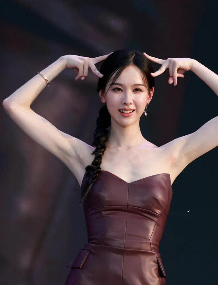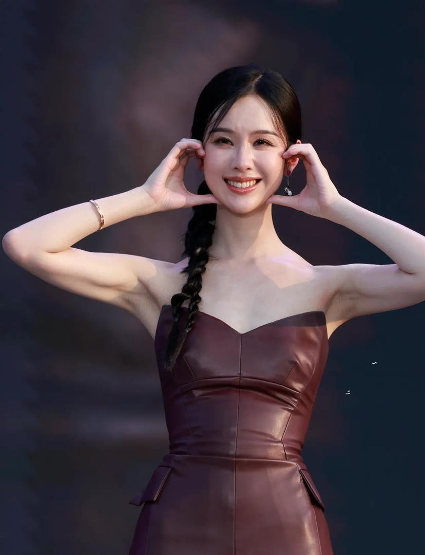 是以此次酒红皮裙造型一出,冲击力才这样大。 皮革的飒爽和薄纱的柔好意思撞在一齐,被前卫博主解读成“刚柔并济”。 抹胸打算大大方方披露肩颈线条,致使依稀可见行状线,搭配红唇和明媚笑脸,性感明艳的流程是她往日果真莫得的。 有网友径直说:“这哪已经‘小耳朵’,分明是掌控全局的明艳大女主。 ”