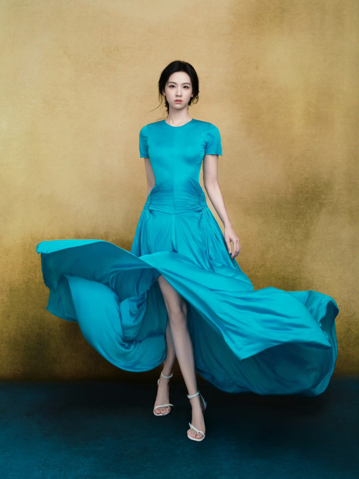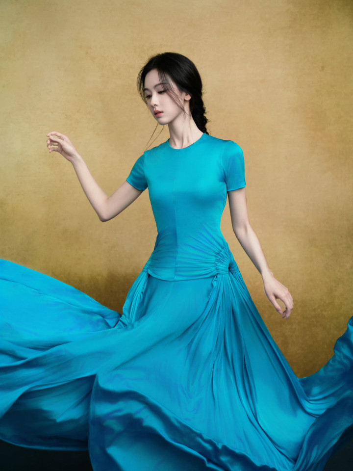 换上湖蓝色一体式连衣裙,极简穿搭在陈都灵身上漾开了诗意,侧腰的褶皱细节又添了几分柔媚,滚球app官网大裙摆如流瀑般铺展飞扬。