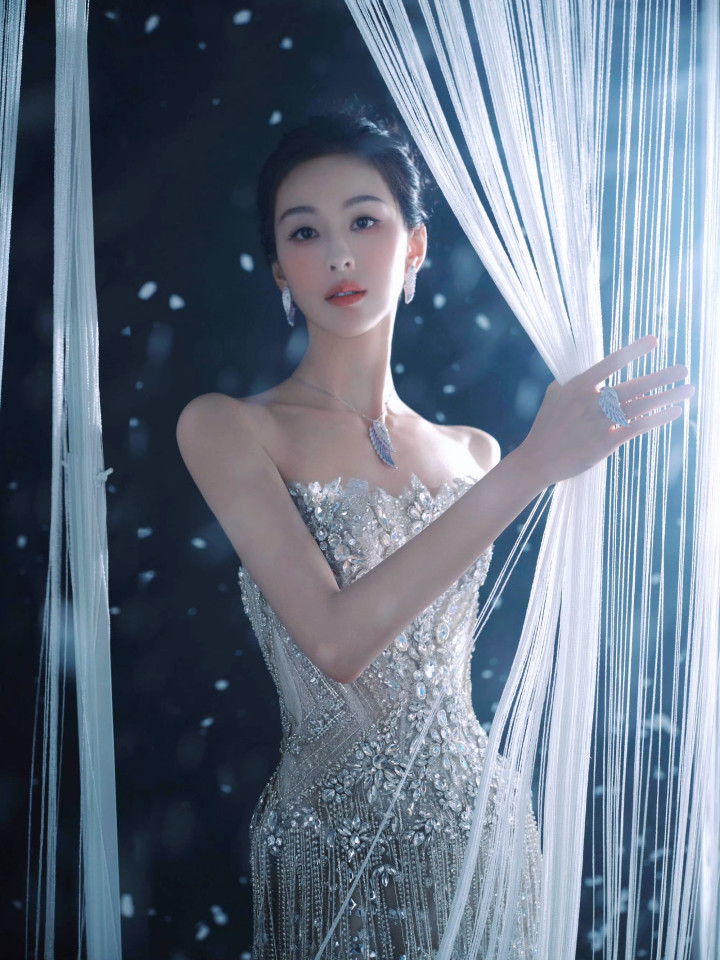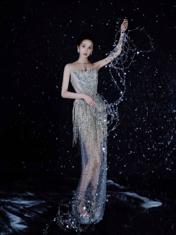 抹胸裙上的碎钻如银河落满周身,层叠流苏随着抬手动作轻晃出细碎光影,搭配同系列的钻饰耳坠与项链,整套穿搭华丽却不张扬。