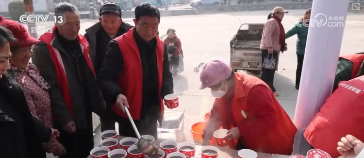 在南京溧水焦赞石村,村民们支起大锅,将糯米、红豆、红枣等食材进行熬煮,一碗碗滚热的腊八粥免费分发给市民和旅客。