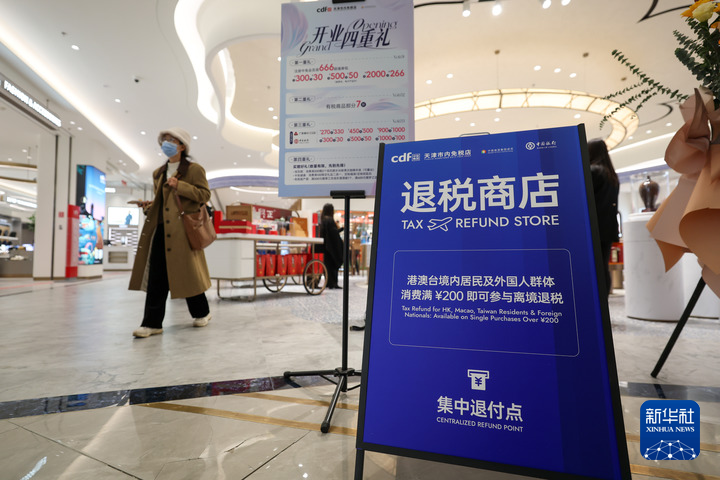 2025年11月28日在天津市内免税店拍摄的退税商店逼近退付点标牌。新华社记者 孙凡越 摄