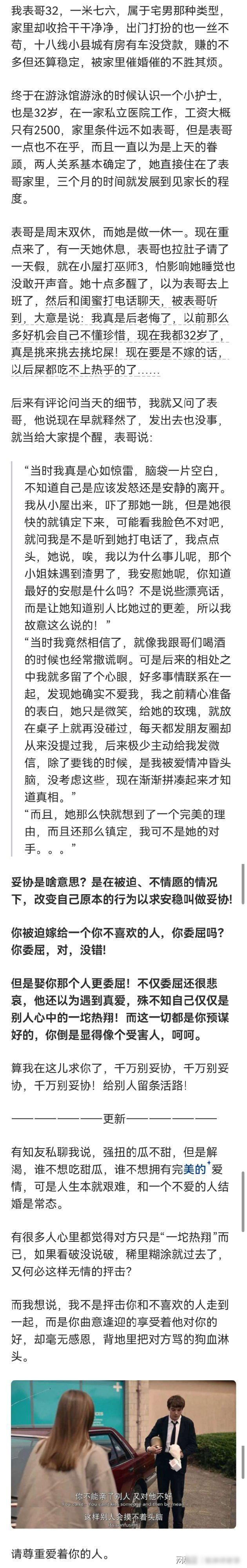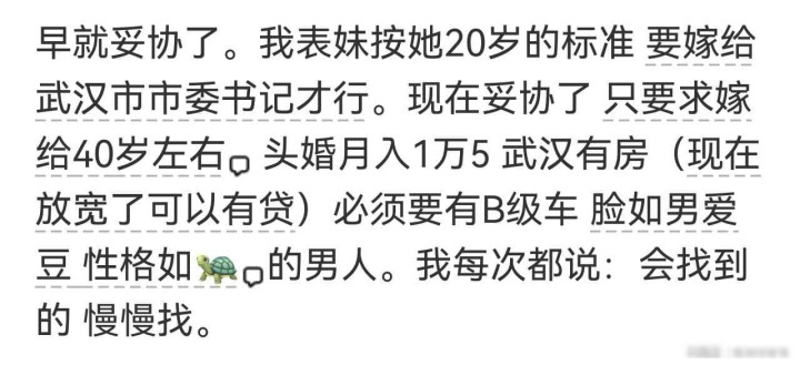 三十多岁的女性常说要看眼缘,要找嗅觉,仔细问起来又讲不出具体条款,嘴上说着不在乎物资条款,实质遴荐时却设下各式门槛,发怵被东谈主说拜金,又不愿径直说出真确念念法,成果等于一直心惊胆落,越挑心里越没底。