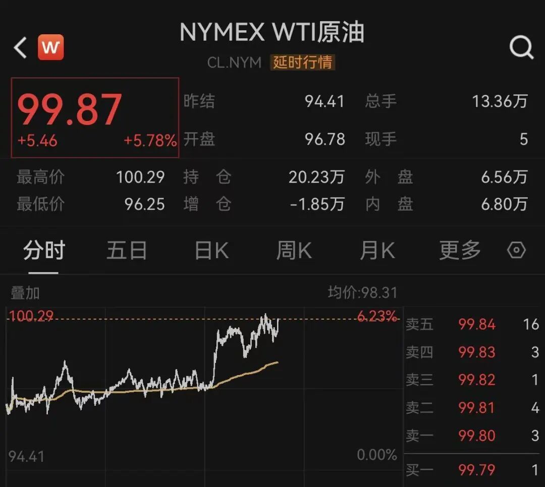 原油飙涨。WTI原油一度再次站上100好意思元关隘,最新报99.87好意思元/桶,涨幅为5.78%。