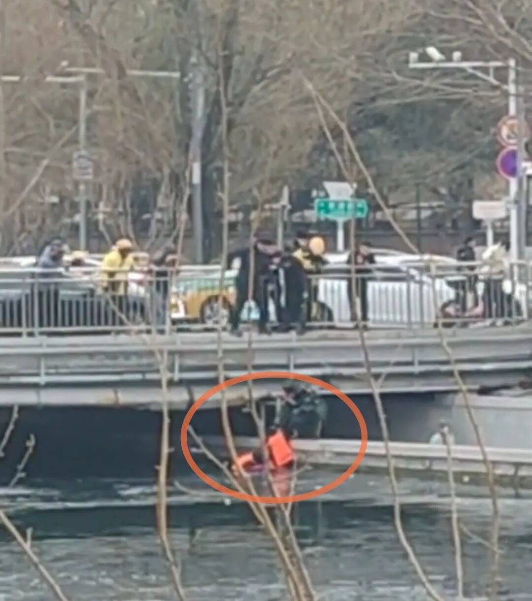 使馆门口摈弃有浮水衣和救生圈,熊黎一边火速穿上浮水衣,一边将救生圈丢给女子,随后他纵身跃入冰冷的河水中,收拢落水女子,并将救生圈套在她脖子上,将她往岸边推。