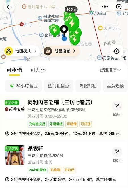 记者在福建省福州市饱读楼区南后街发现,不同门店内同品牌分享充电宝的计费门径存在相反。页面截图