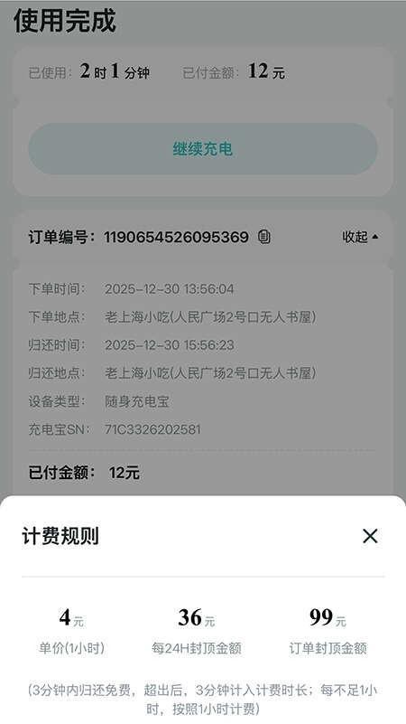 {jz:field.toptypename/}2025年12月30日,记者在上海市东说念主民广场租赁“怪兽”分享充电宝,充电2小时1分钟,收费12元——多出来的1分钟,按1小时计费,需支付4元。