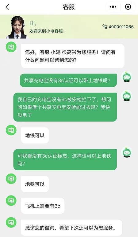 2026年1月1日,记者在上海浦东某剃头店立时租赁2台分享充电宝斥地,结果发现2台斥地均无3C认证。店铺矜重东说念主告诉记者:“这一批充电宝莫得3C认证,是老款,莫得更新过。”此外,记者们分头看望了多个市集和沿街商铺发现,仍有少许无3C认证的分享充电宝在市面流通。针对无3C认证分享充电宝的使用风险,记者在福建以奢靡者身份测度了小电客服。对方修起称,佩带此类充电宝“不错平方乘坐地铁。”