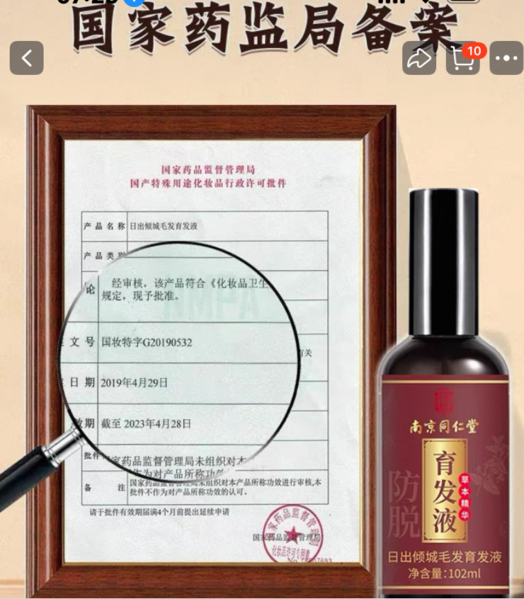 在另一购物平台,一家名为“百年品牌名品店”的网店销售一款育发液,瓶身标注居品名为日出倾城毛发育发液,并标称“南京同仁堂”,居品声称“头发日渐浓防脱育发”“措置多样脱提问题”,并标称“抓证育发正品保证”;海报上用大字标注“国度药监局备案”,下方附有国产出奇用途化妆品行政许可批件图,裸露批准文号为国妆特字G20190532,灵验期适度2023年4月28日。通过化妆品监管App查询,该居品坐蓐厂家为广州市妆姸生物时刻有限公司,批号已过时。