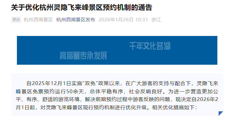 1月26日,杭州灵隐飞来峰景区发布公告,将于2月1日起优化养息预约机制:线下登记入园的窗口将被取消,同期敞开“线上候补”功能,收紧“违约”边界,营造愈加公谈、有序、昌盛的游览环境。