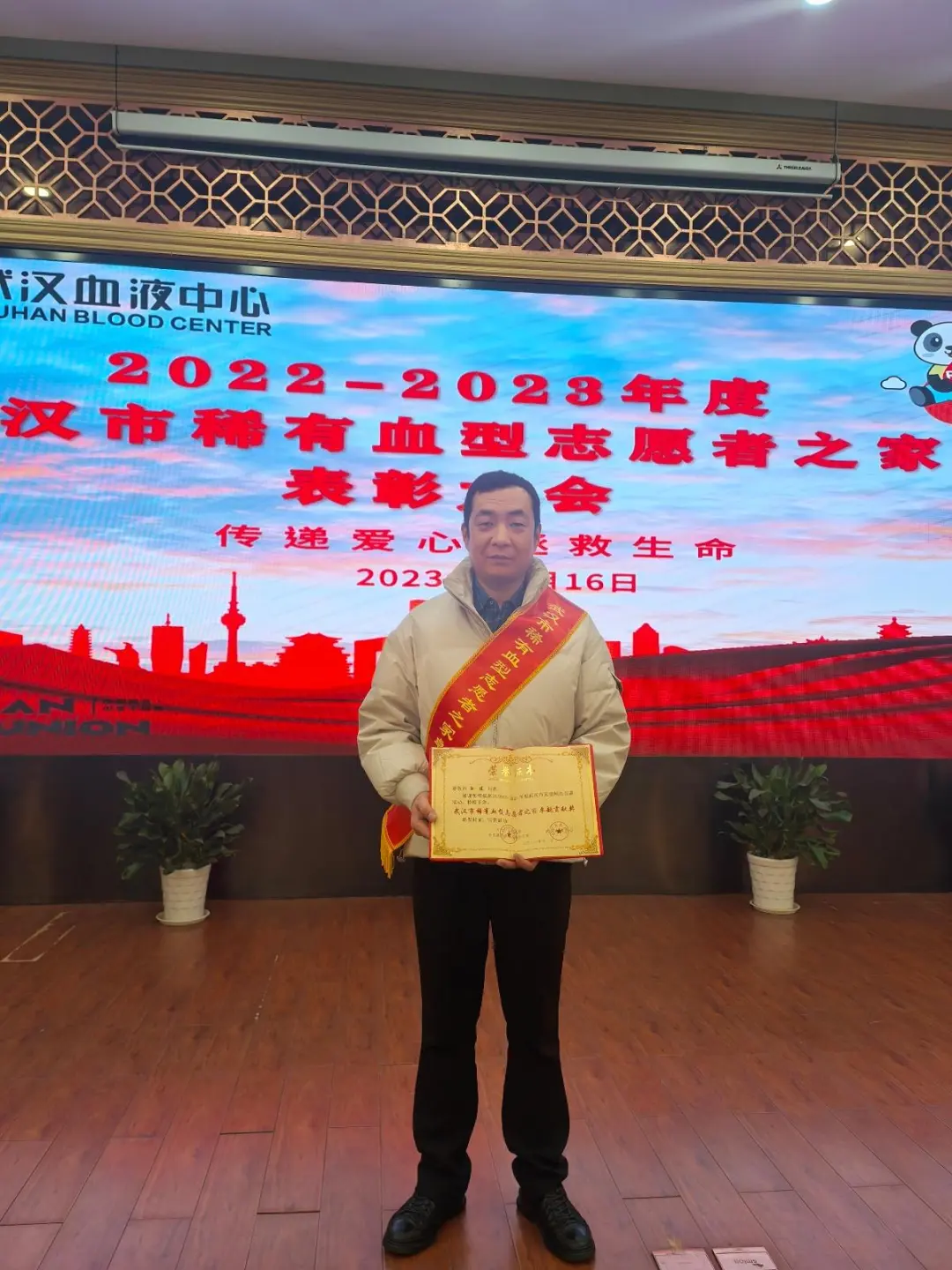 孙建曾赢得“武汉市珍惜血型志愿者之家超卓孝顺奖”。受访者提供