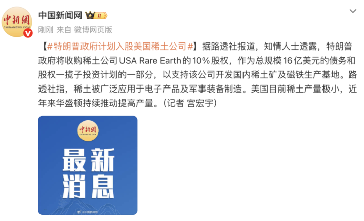 据中国新闻网征引路透社报说念,知情东说念主士透露,特朗普政府将收购稀土公司USARareEarth的10%股权,看成总范围16亿好意思元的债务和股权一揽子投资权术的一部分,以复旧该公司建树国内稀土矿及磁铁分娩基地。
