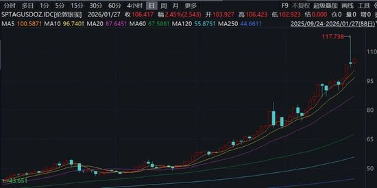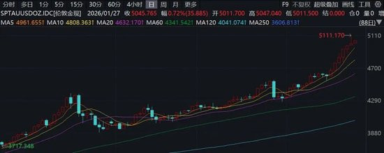 分析称,受政事与财政风险飞腾鼓舞,投资者转向避险金钱。1月26日黄金价钱一度大涨2.5%,创下每盎司5100好意思元以上的历史新高。现货白银日内涨幅一度高达14%,最高涉及117好意思元/盎司。不外外洋金银在冲高后大幅跳水,现货白银尾盘转跌,报约102.8好意思元/盎司。现货黄金向下落破5000好意思元/盎司,收涨0.26%。