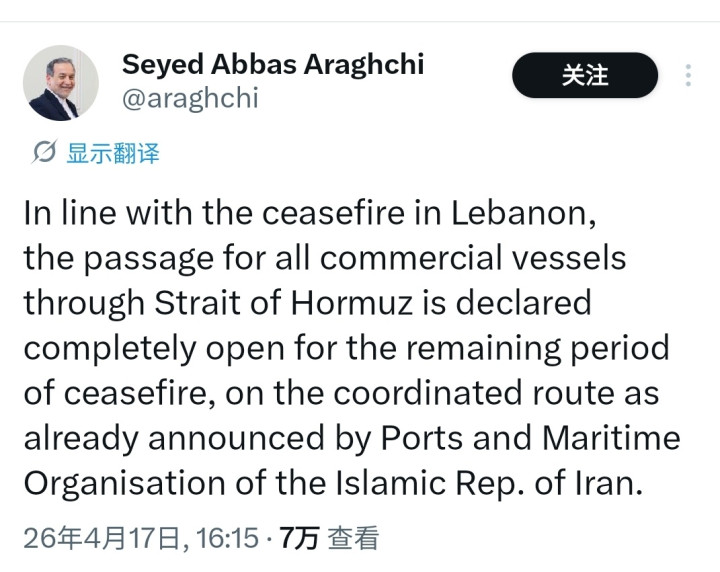 当地时分17日下昼,伊朗外长阿拉格皆在社交媒体发文称,鉴于黎巴嫩和以色列达成停战,在停战技能,伊朗对所有商船通达霍尔木兹海峡。