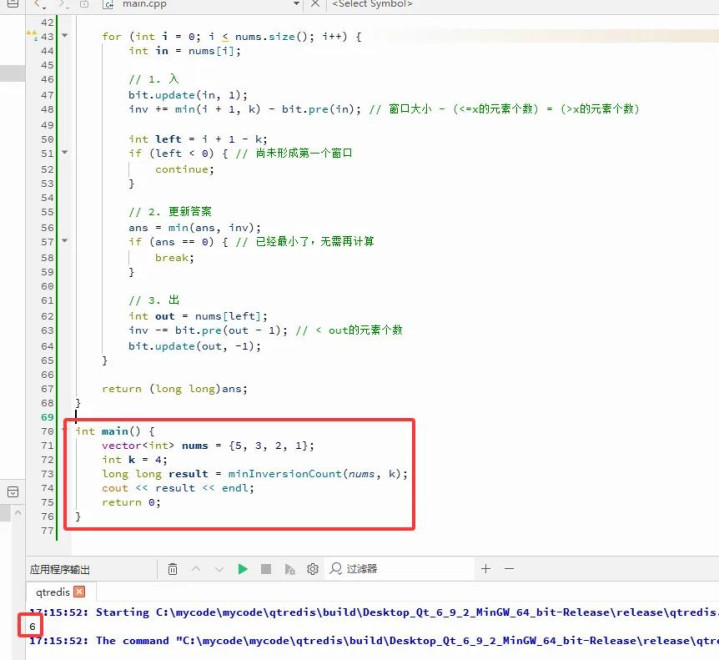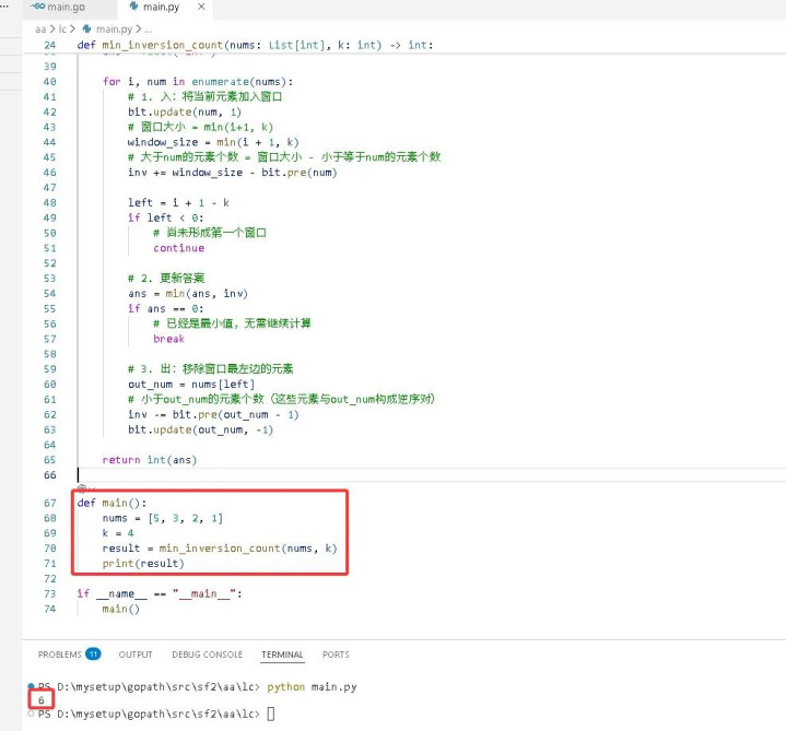 通盘数组遍历完成,唯独的灵验窗口逆序对总额为6,最终复返6。