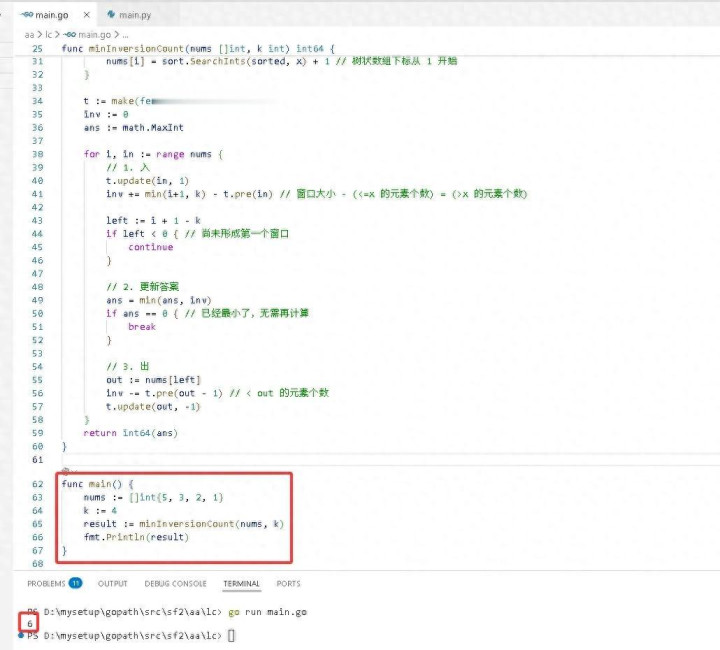 4. 更新最小谜底:刻下逆序对总额6是最小值,ans=6。